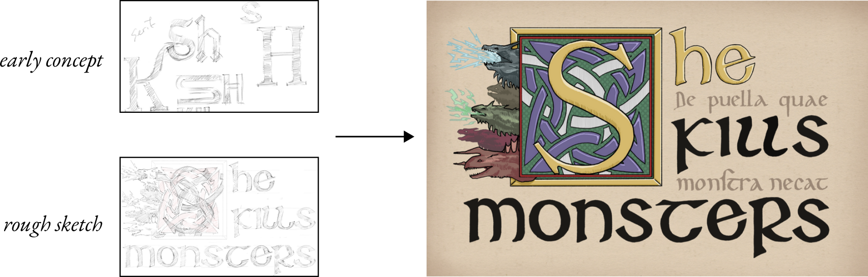 I started with the title typography, for which I imagined a variety of different styles as concepts, including a romantasy-style serif, modern stretched sans-serif, and maybe just Helvetica. In the end, I settled for a stereotypical fantasy visual style with Roman drop capitals, insular minuscules, and Latin marginalia.