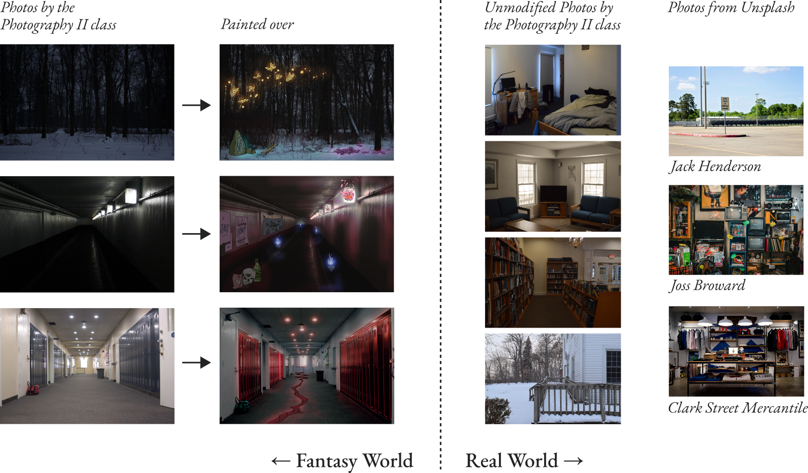 I collected other photos online and from the school’s photography class. Most of the fighting and drama occurs in the DnD fantasy world that reflects the dead protagonist’s struggle in high school, so I decided to use real photos of the school throughout the scenography. To delineate real-world from fantasy, I drew over the photos used in the fantasy setting and added a colored glow to some of these elements. I did not have the time to plan what to add or make separate backgrounds for different stages in the adventure through the fantasy world, but the intention is, at the very least, legible.
