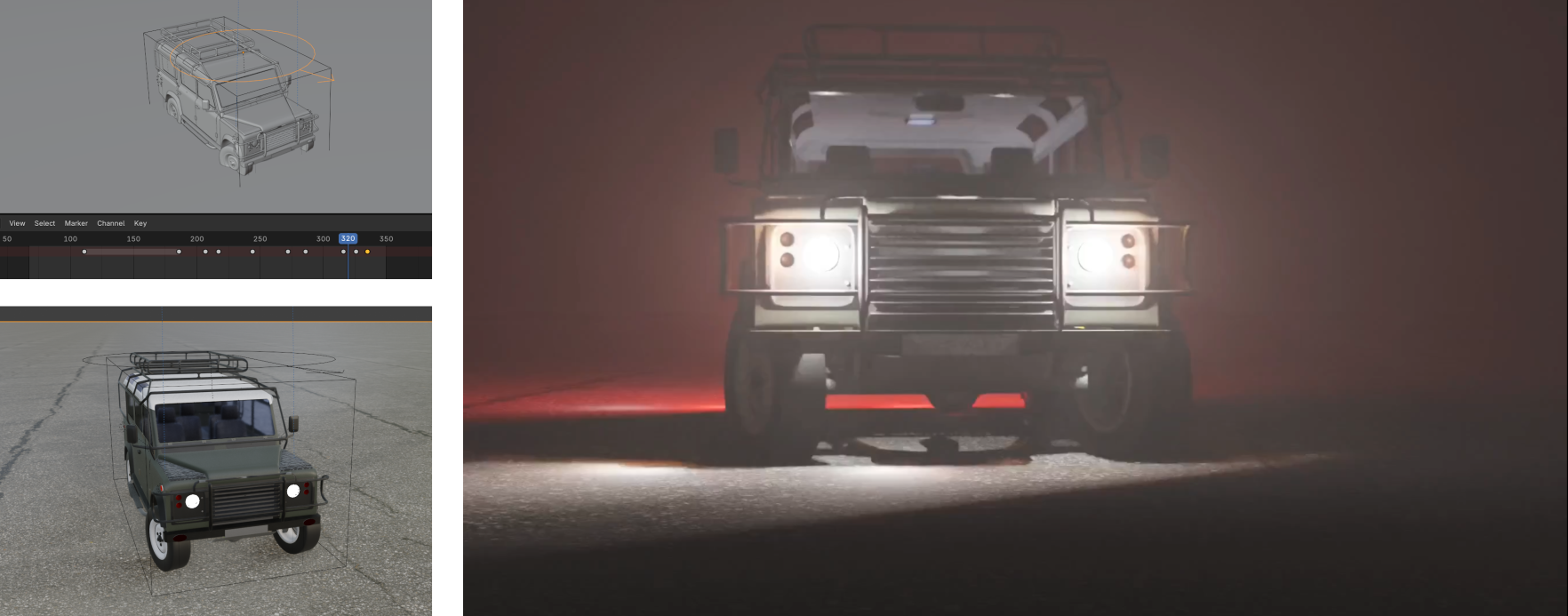 In the prologue, one of the protagonists dies in a car crash. I decided to pick up 3D animation again and rendered a somewhat awkwardly animated car crashing into the virtual camera and fading to white. This led me to wrestle with Blender’s volumetric fog rendering for quite a bit, but was overall easy thanks to an awesome, almost ready-to-use model of the Land Rover Defender 110.